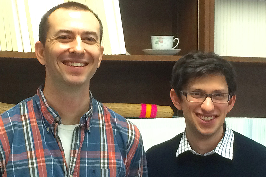 Neil Wechsler, left, wearing a blue, red and white plaid open-collared shirt, and Nathan Heidelberger, wearing a white collared shirt and black pullover sweater.