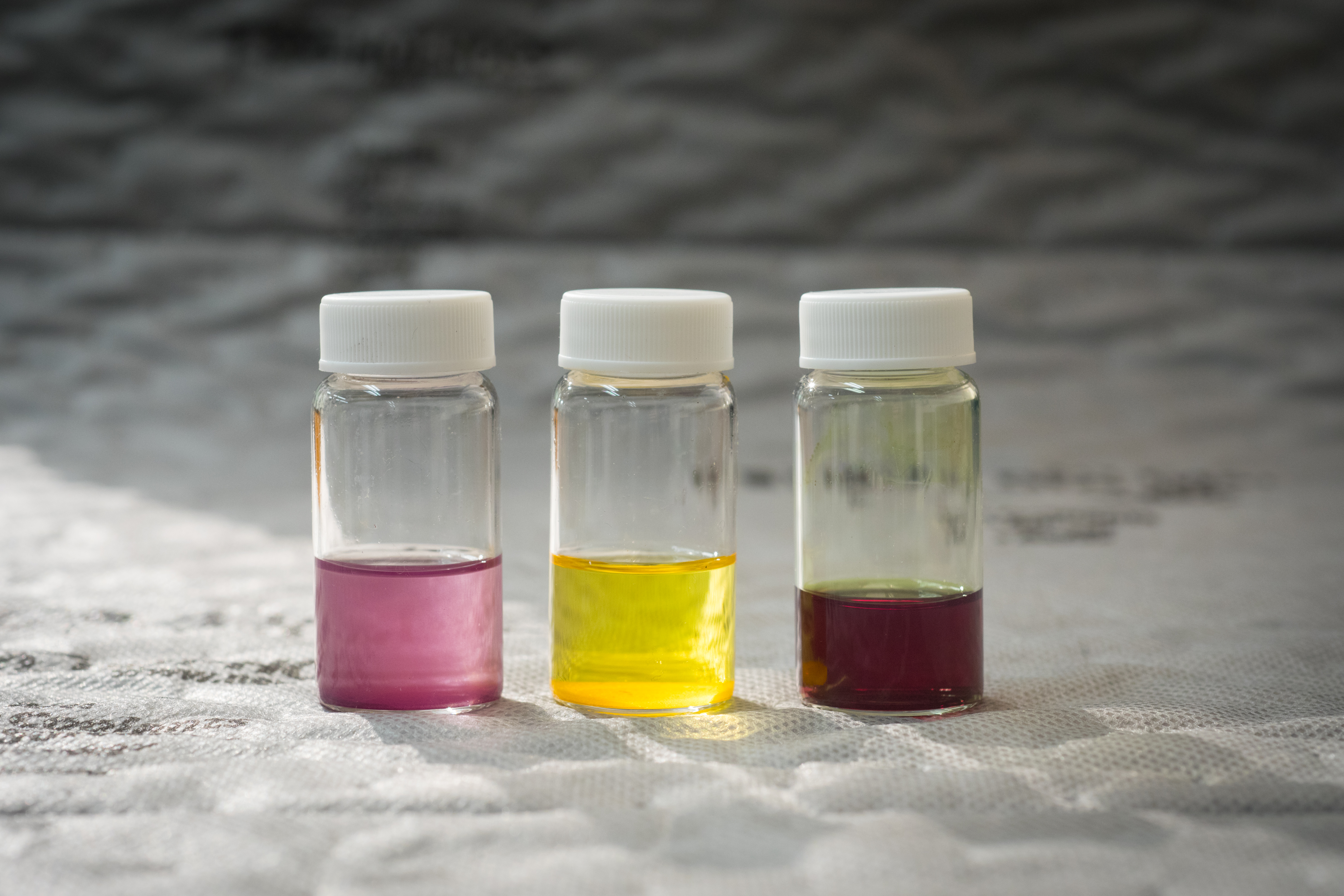 The new catalyst, a cofacial cobalt porphyrin, is created using molecular self-assembly. During this process, a vial filled with molecules called cobalt porphyrins (vial on the left) are mixed with a vial of ruthenium “clips” (vial in the center). The end product, the cofacial cobalt porphyrin catalyst, is pictured in the vial at the right. Credit: Douglas Levere/University at Buffalo