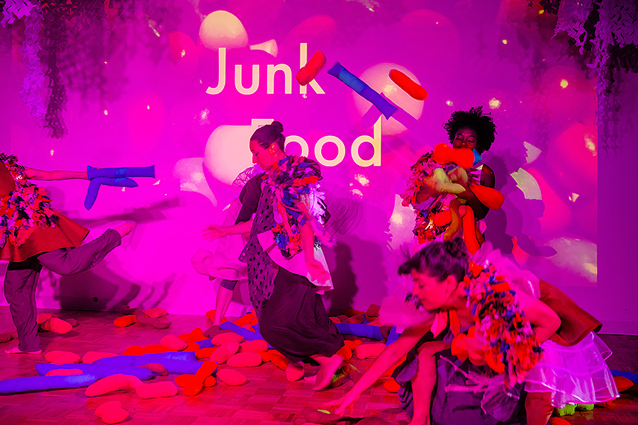 Dancers throwing objects in front of sign that says junk food.