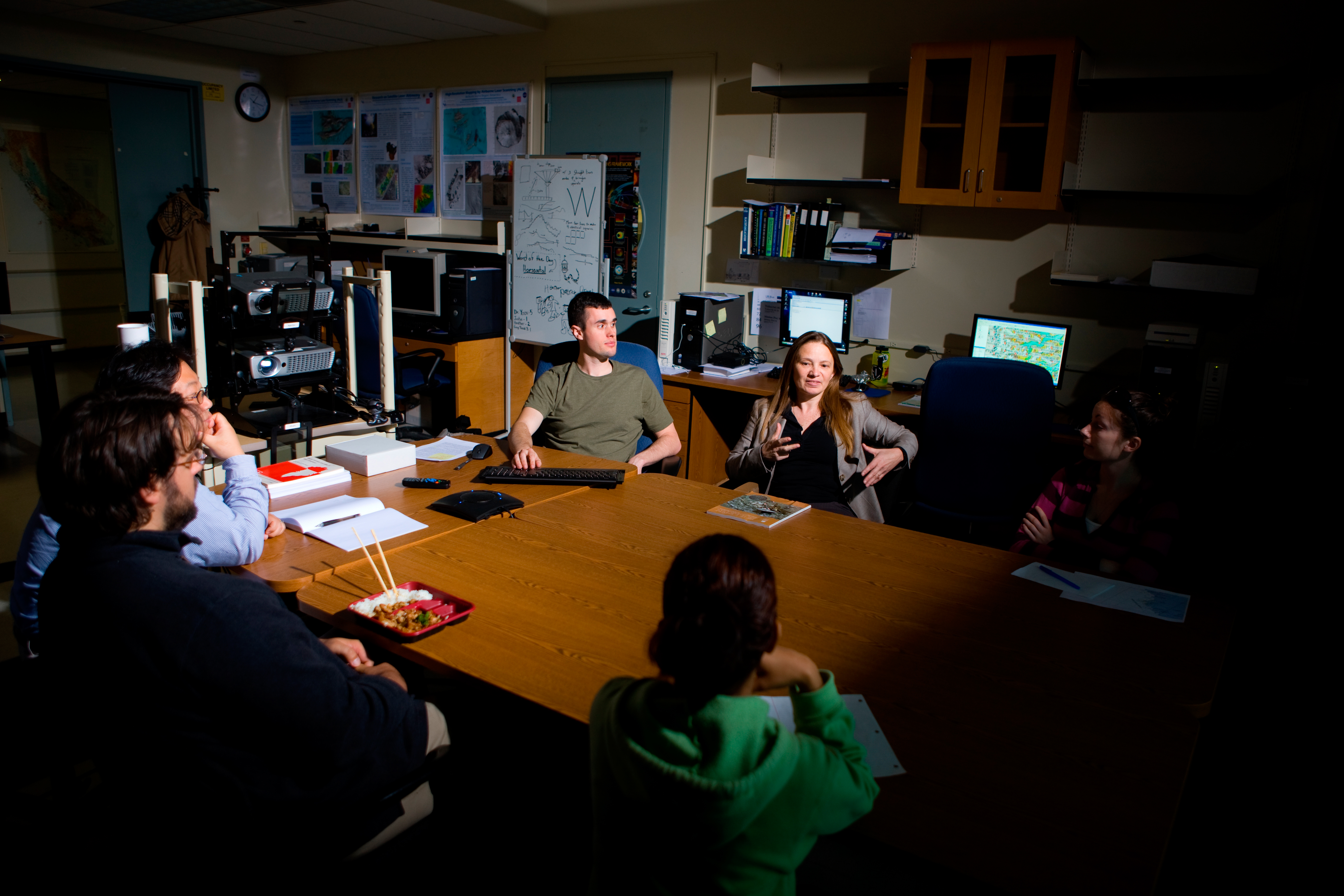 University at Buffalo researcher Beata Csatho (center, in blazer and black shirt) leads a meeting with her research group on UB’s North Campus. From 2011-14, Csatho, a renowned climate scientist and chair of UB’s Department of Geology, headed the Science Definition Team that helped determine the scientific requirements of NASA’s ICESat-2 satellite. Credit: Douglas Levere/University at Buffalo