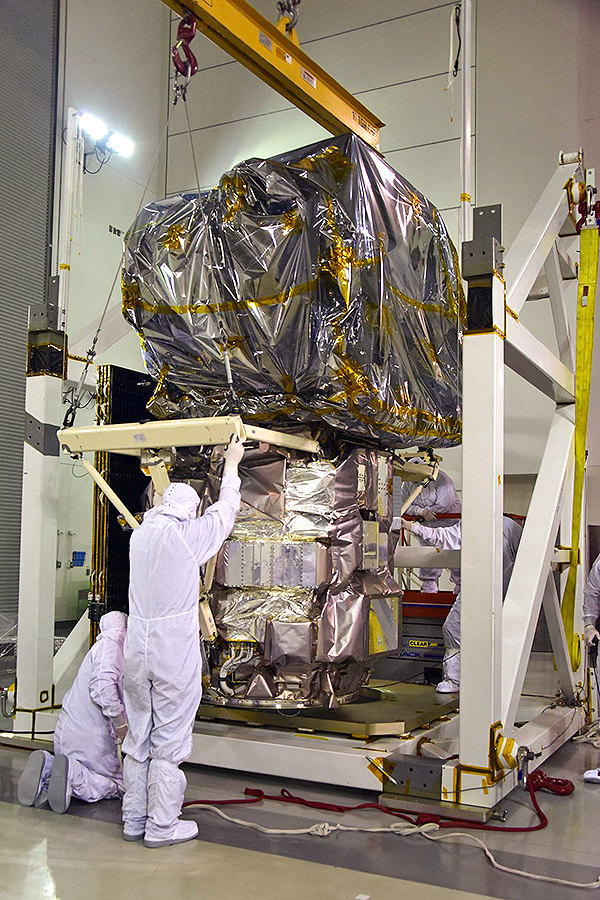 Technicians assist as a crane rotates NASA's Ice, Cloud and land Elevation Satellite-2 (ICESat-2) into position for removal and lift to a work stand in the high bay of the Astrotech Space Operations facility on June 14, 2018, at Vandenberg Air Force Base in California. Credit: NASA/USAF 30th Space Wing/Aaron Taubm