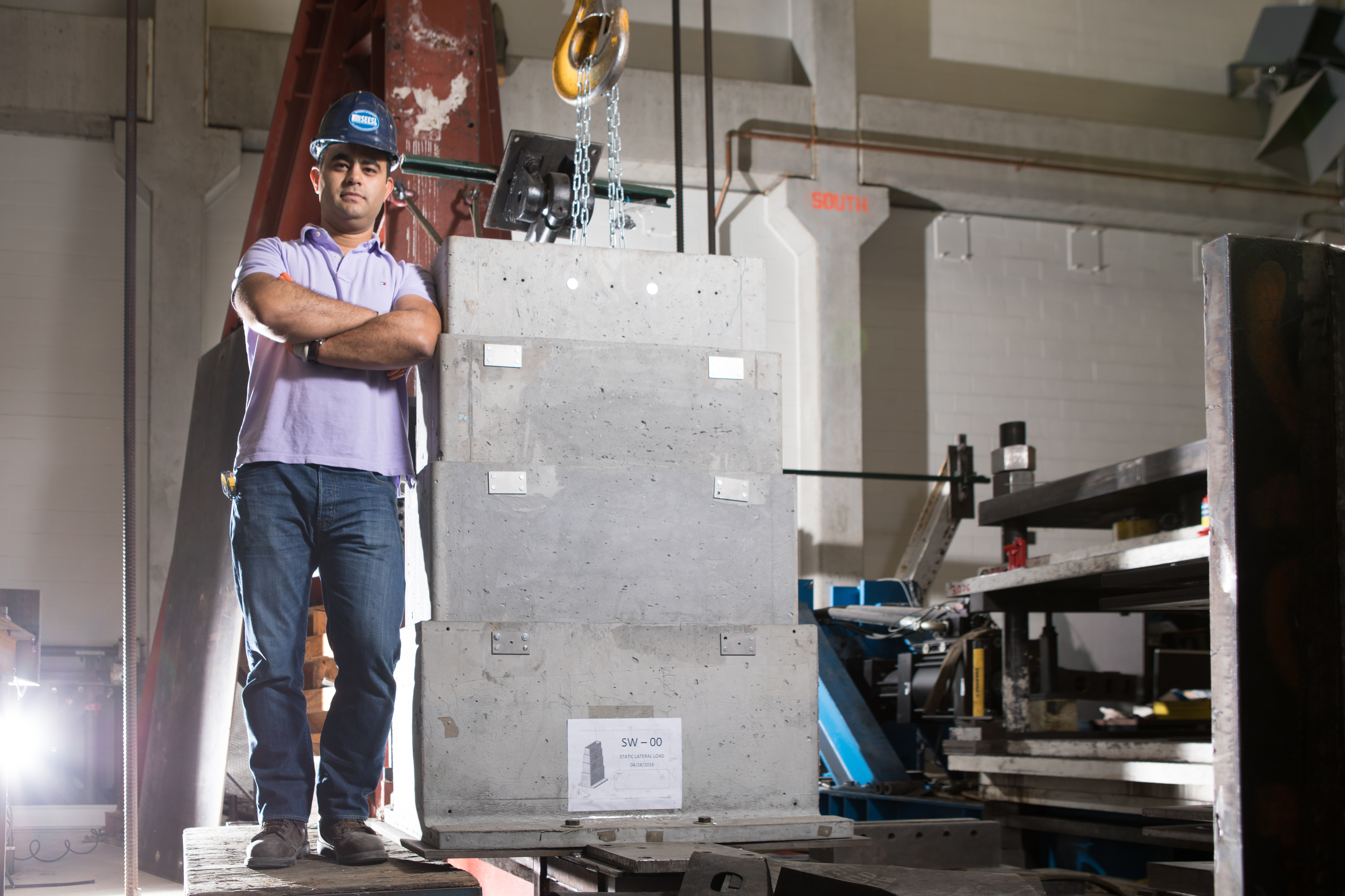 University at Buffalo PhD candidate Jorge Cueto (polo shirt), founder of Smart Walls Construction LLC, in the lab developing telescopic flood walls. Credit: Douglas Levere, University at Buffalo.