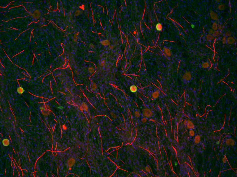 Fluorescence microscopy image of in vitro model of myelin sheath (red) formation by Schwann cells around neuronal axons (green). Cell nuclei are blue. Credit: Keit Men Wong, UB.