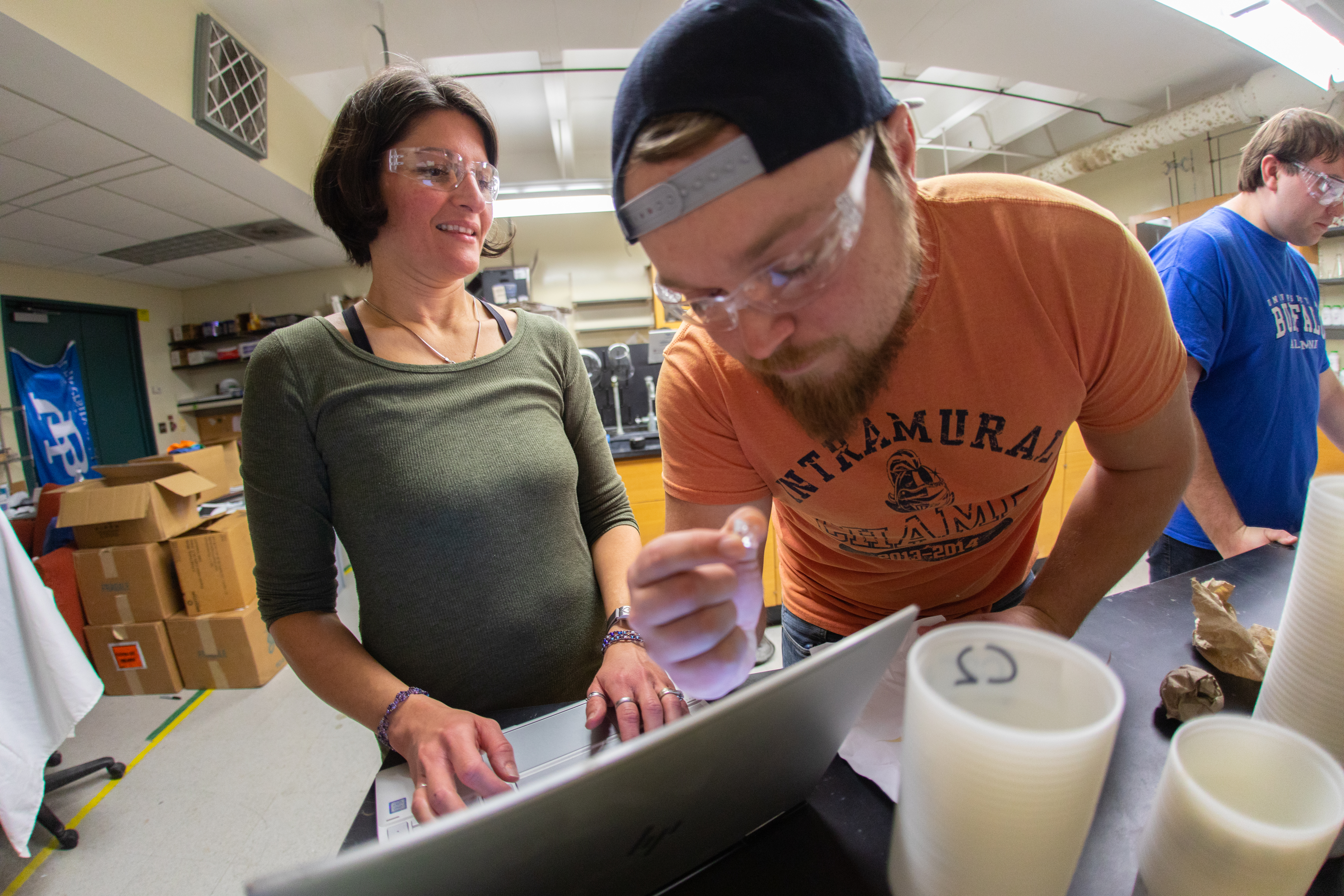 From left: Tasha Benedict, the competition's administrative assistant, enters data about crystals into a laptop with help from UB chemistry PhD student Gage Bateman and UB chemistry master's student Devin Angevine. Credit: Douglas Levere / University at Buffalo