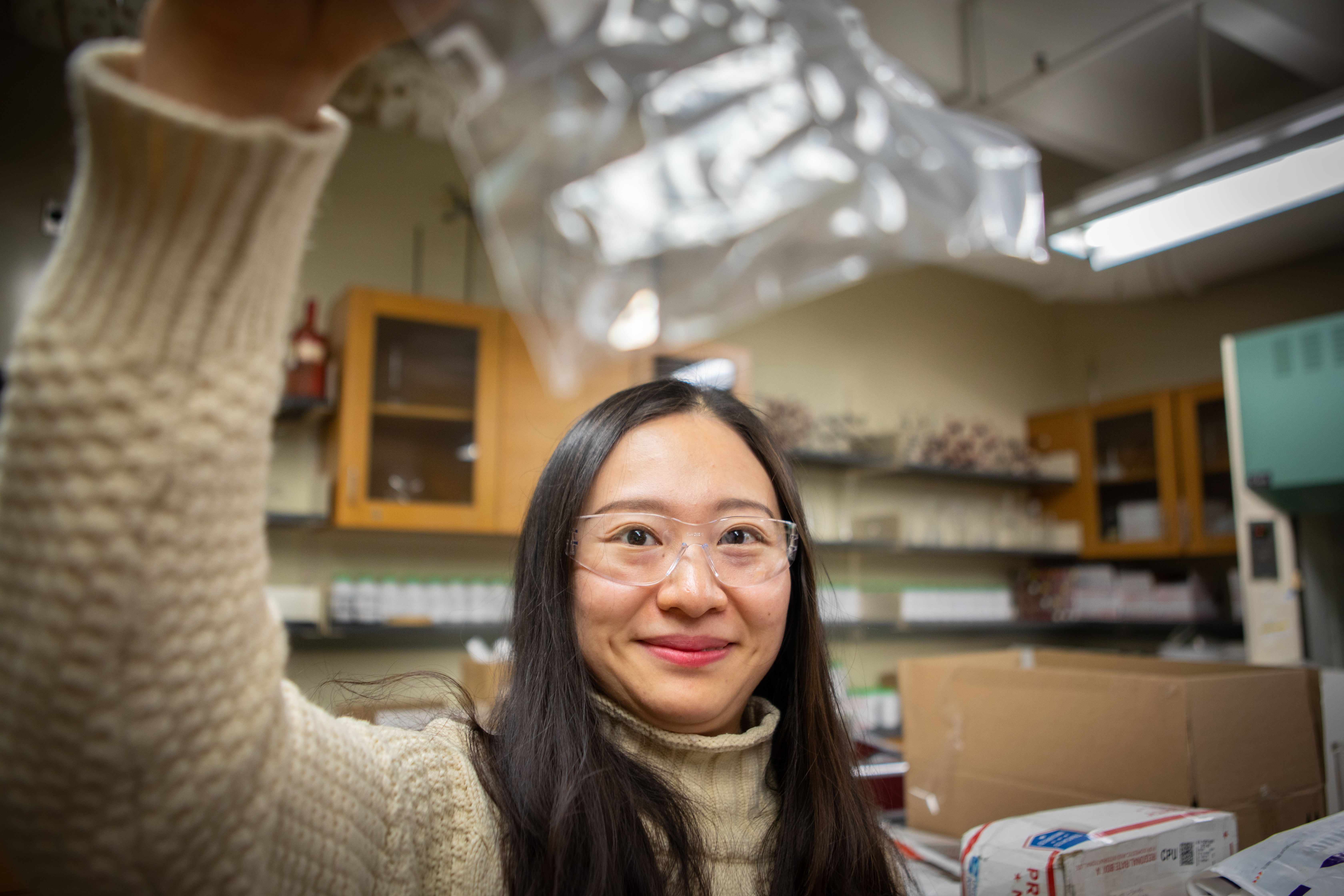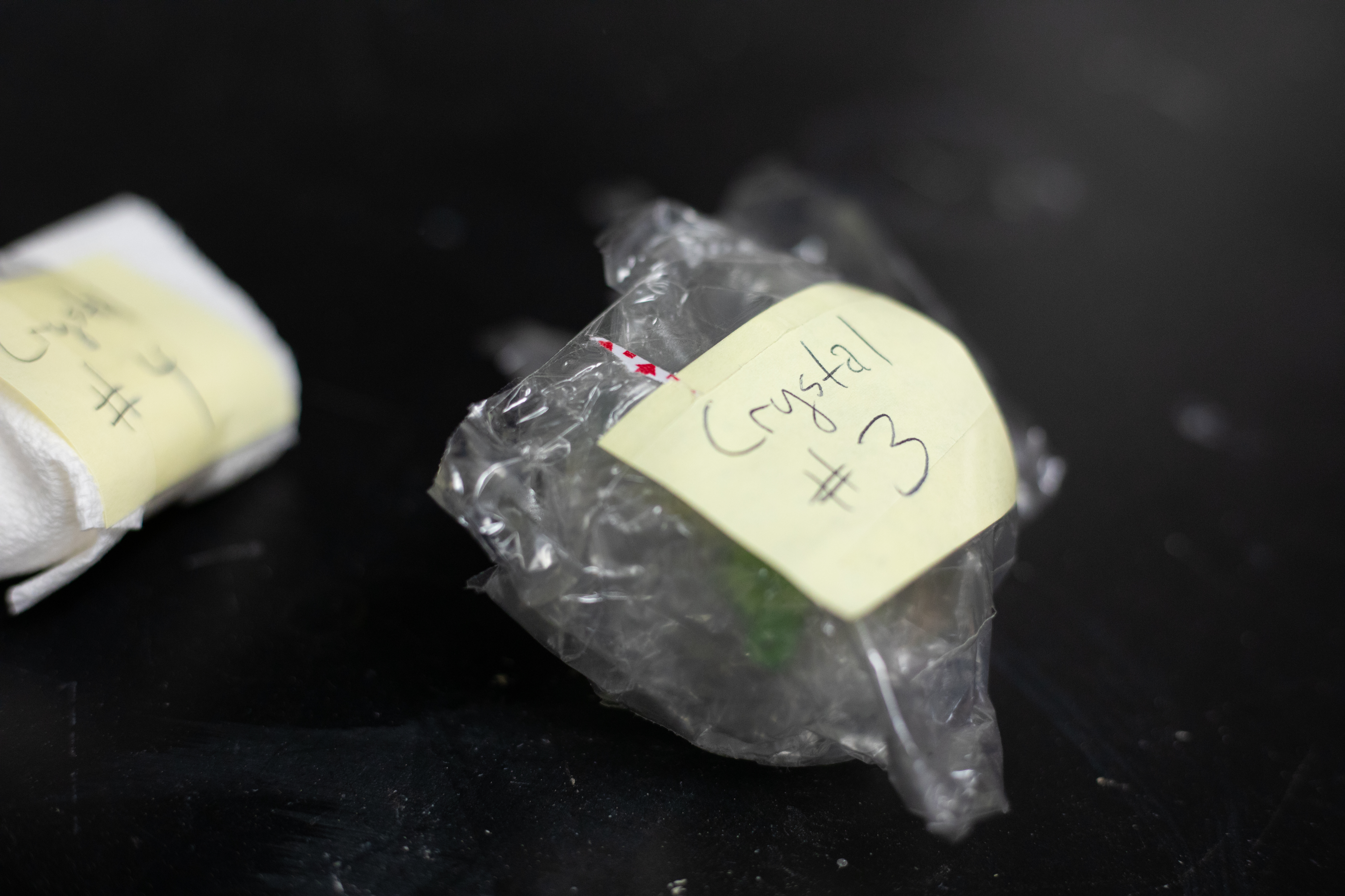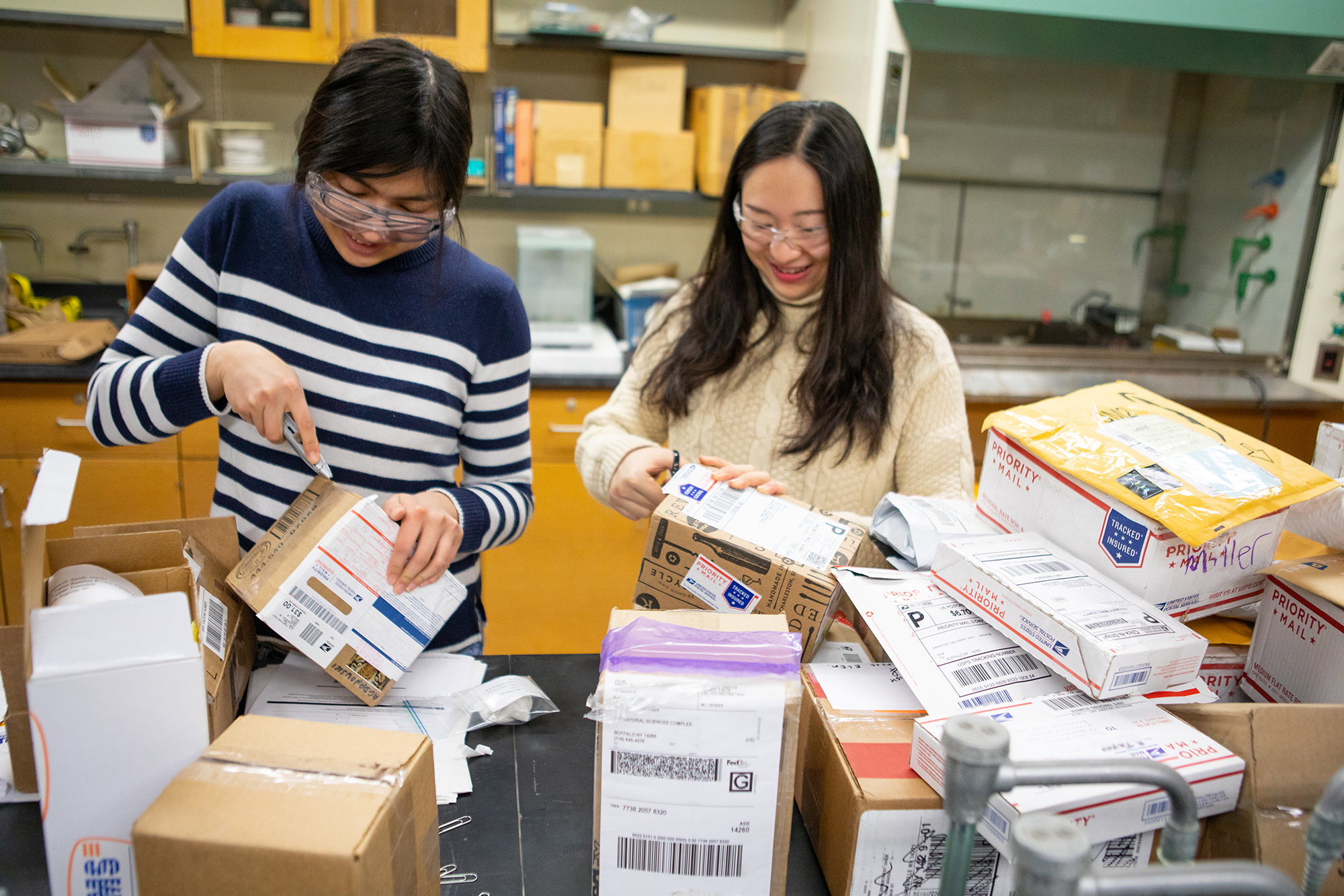 From left: UB chemistry PhD student Zoe Marr and UB chemistry master's student Xiaotong Zhang open boxes and envelopes holding crystals mailed to UB. Credit: Douglas Levere / University at Buffalo