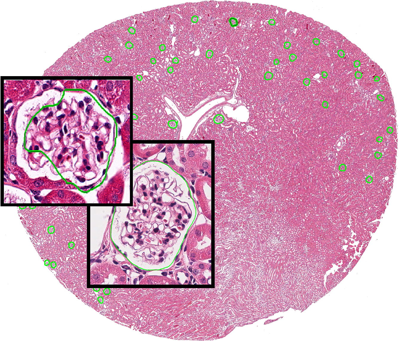 The image shows how the UB tool works, when applied to histology image data. The large background image shows a mouse renal tissue section with kidney structures called glomeruli marked via automatically estimated boundaries. The boundaries can be iteratively updated during system training. The glomeruli structures change when the disease has progressed. (Image: Brendon Lutnick)
