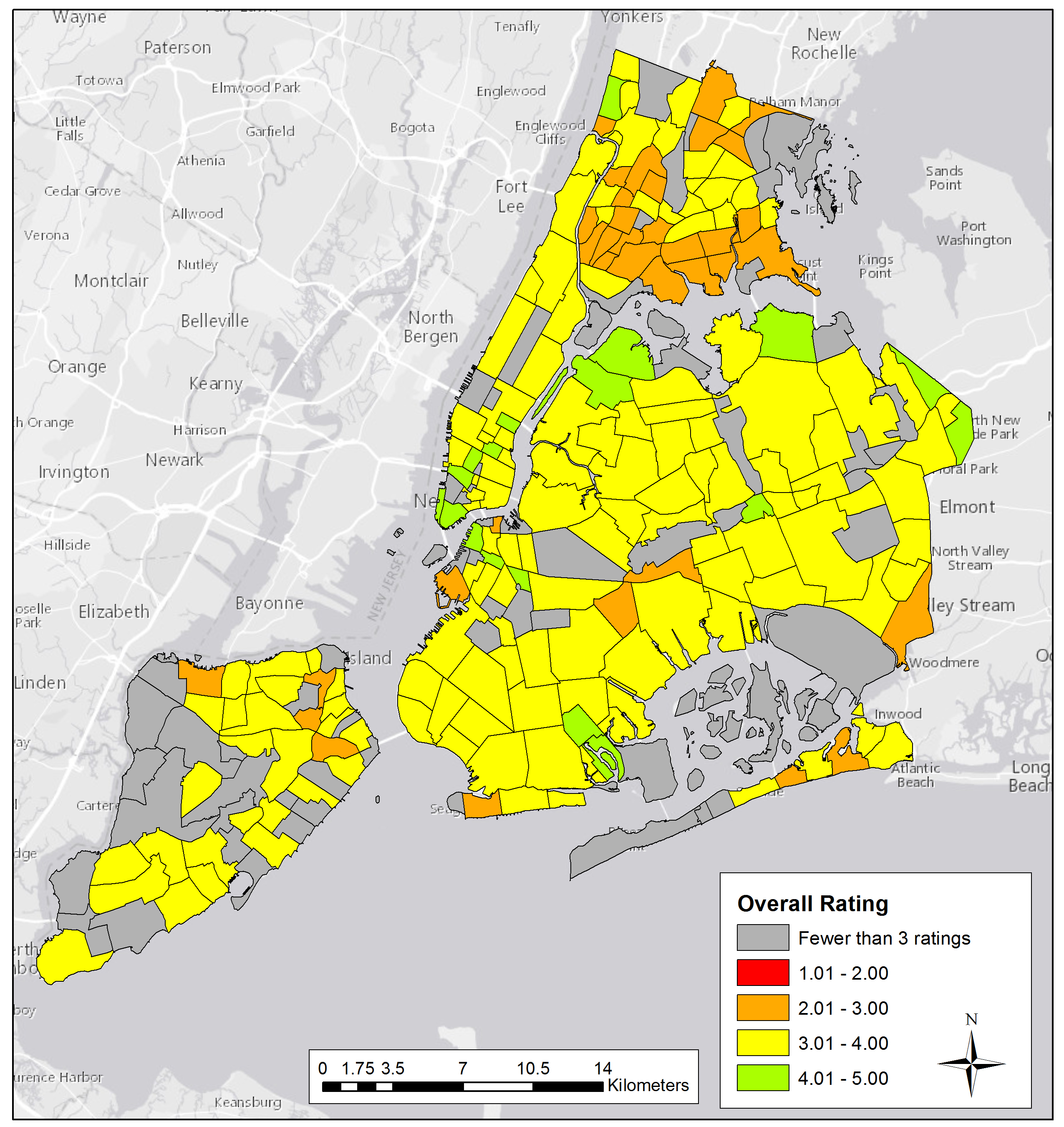A map showing the average review ratings for various neighborhoods in New York City based on reviews on Niche.com during the study period, with 5 being the highest rating possible. Credit: Yingjie Hu