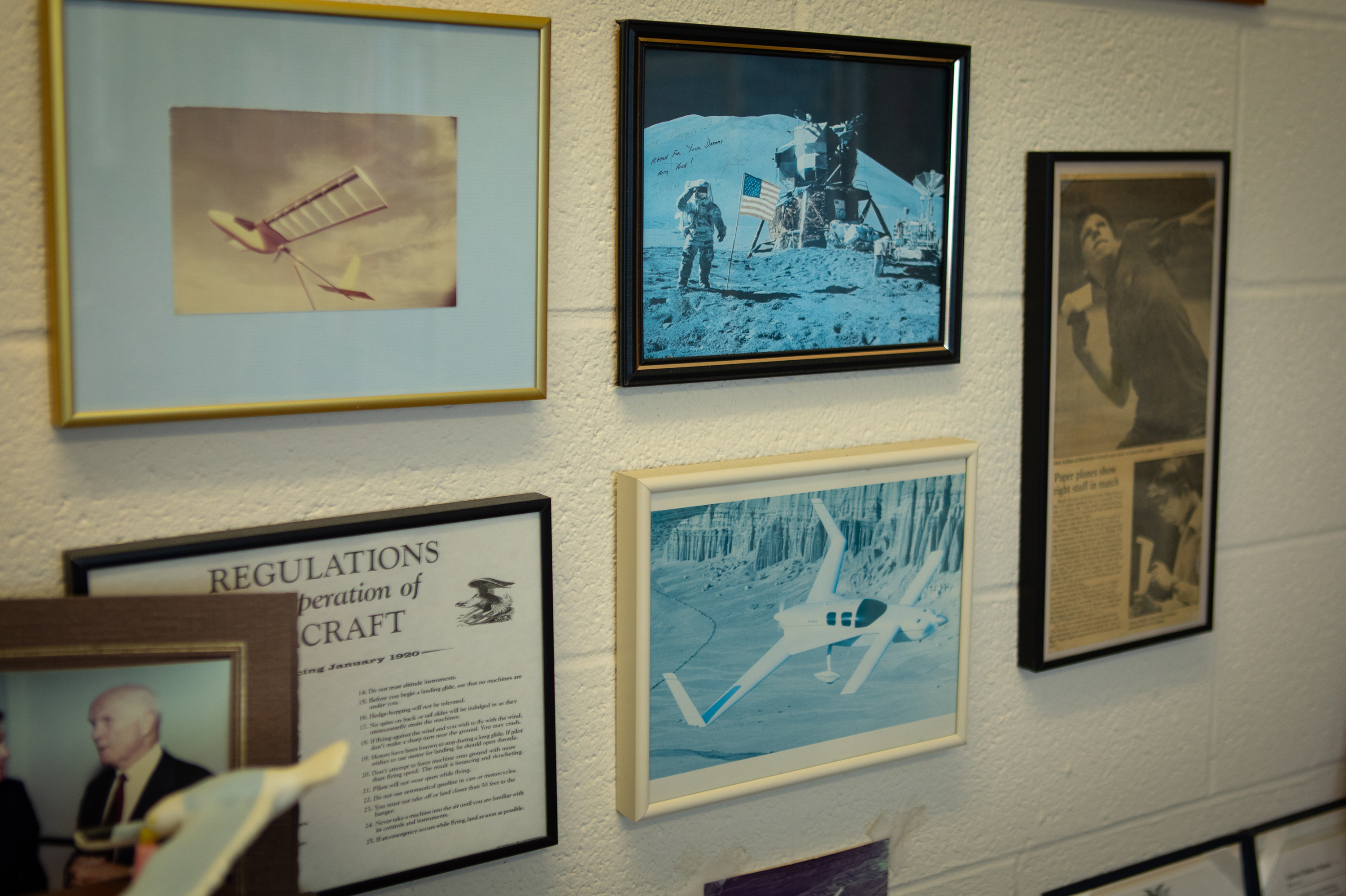 Mollendorf’s Jarvis Hall office is full of aerospace memorabilia. The items pictured here range from a signed photograph of Astronaut James Irwin on the moon to a newspaper clipping on a paper airplane contest he hosted for high school students. Credit: Douglas Levere / University at Buffalo