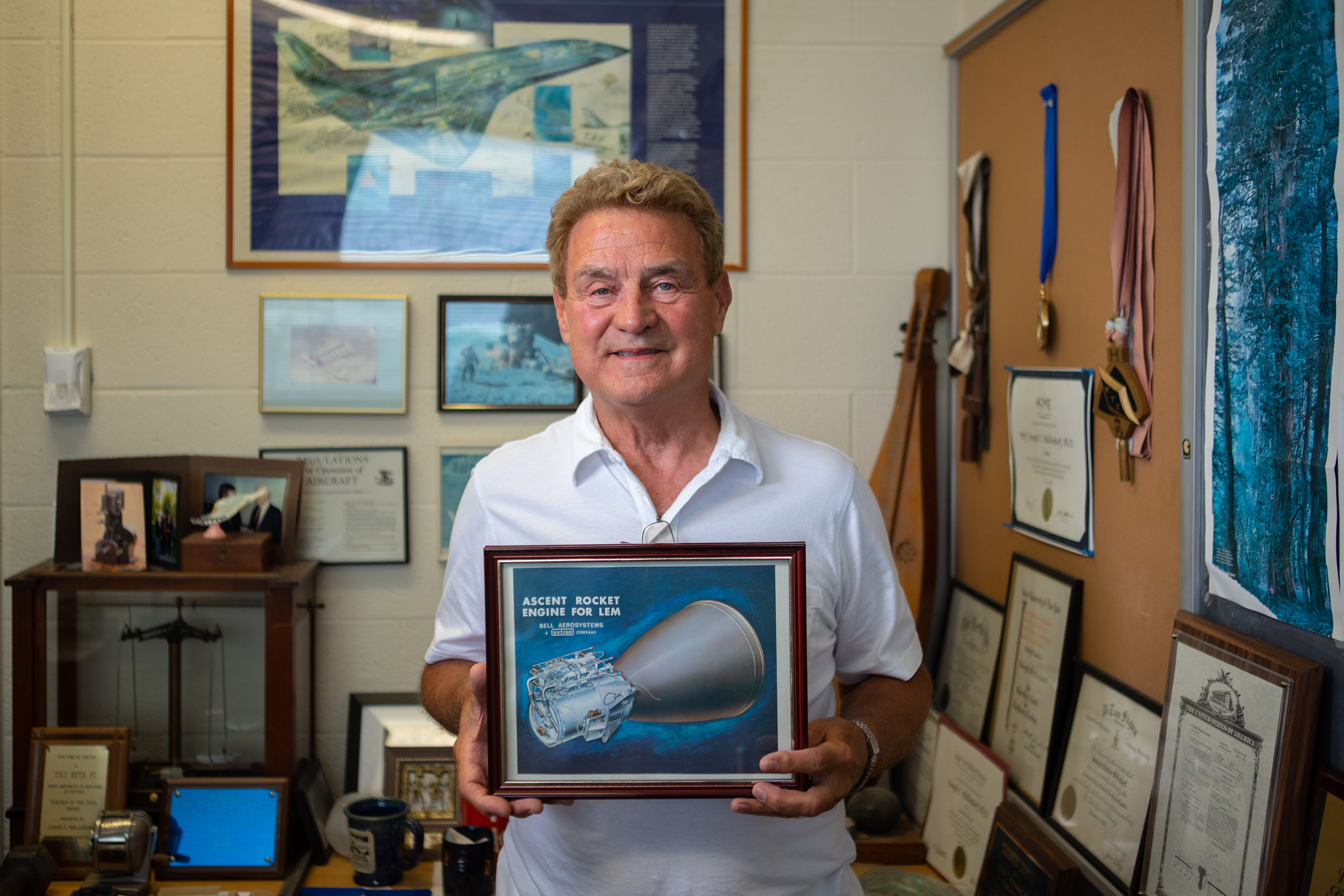 Joseph Mollendorf, SUNY Distinguished Teaching Professor of Mechanical and Aerospace Engineering at UB, in his Jarvis Hall office. He’s holding an illustration depicting Bell Aerosystems’ Lunar Excursion Module ascent rocket engine, which he worked on in the summer of 1966. Credit: Douglas Levere / University at Buffalo