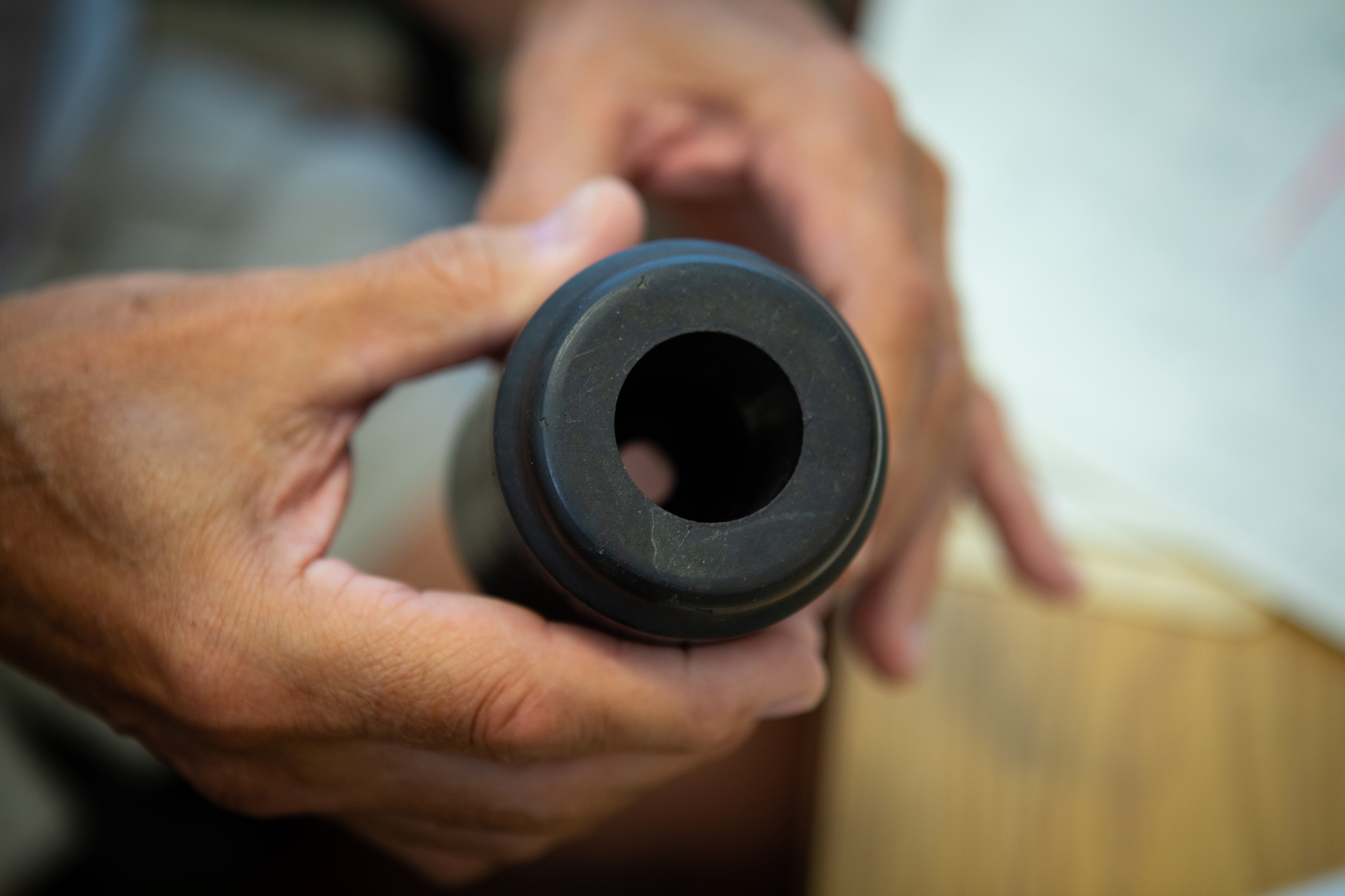 Mollendorf holds a souvenir from his summer job at Bell Aerosystems: a thruster nozzle designed for use in steering lunar landers. This particular thruster nozzle was never tested. Credit: Douglas Levere / University at Buffalo