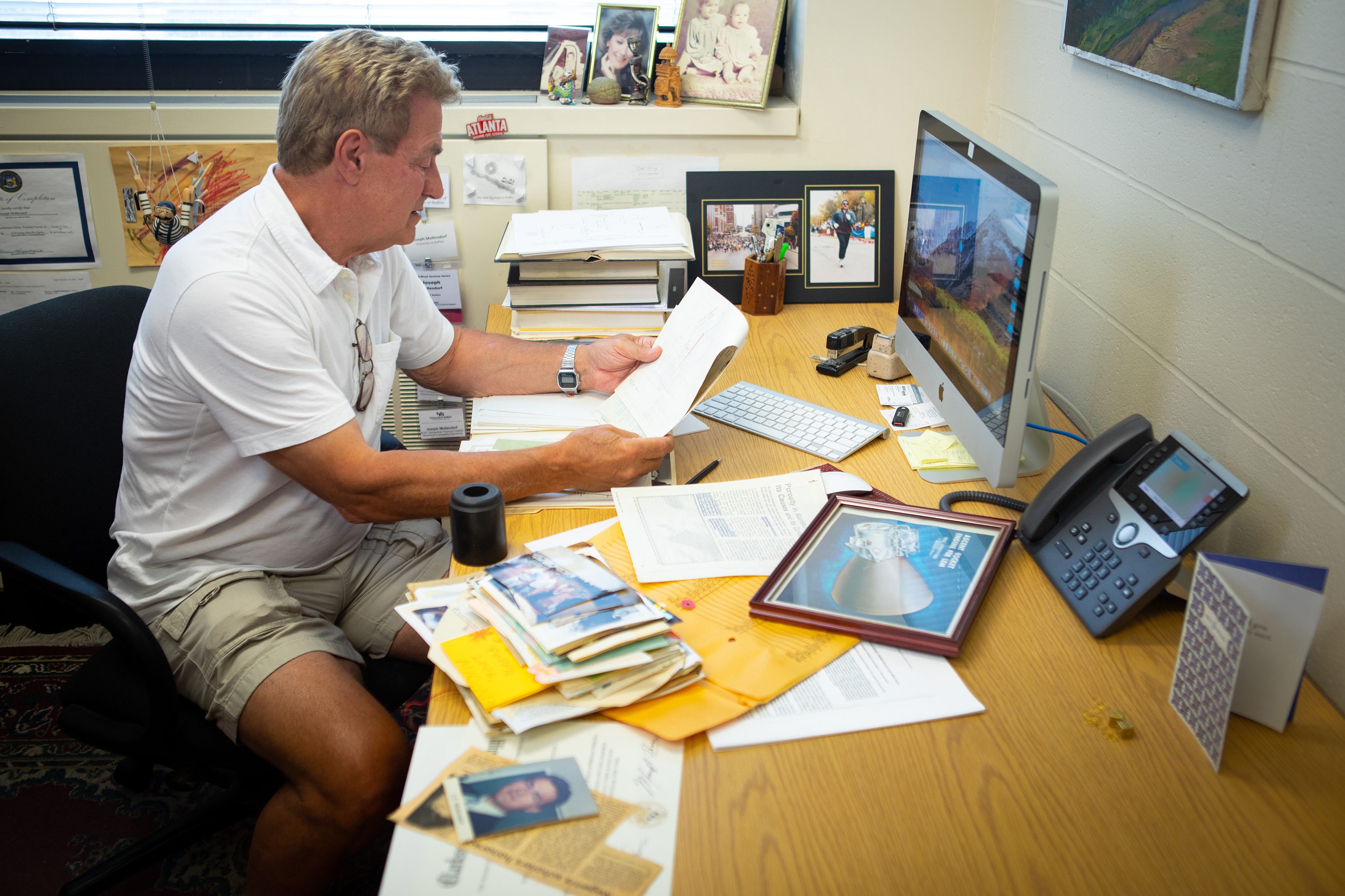 Mollendorf examines papers from a file folder filled with documents from his 1966 summer job at Bell Aerosystems. Credit: Douglas Levere / University at Buffalo