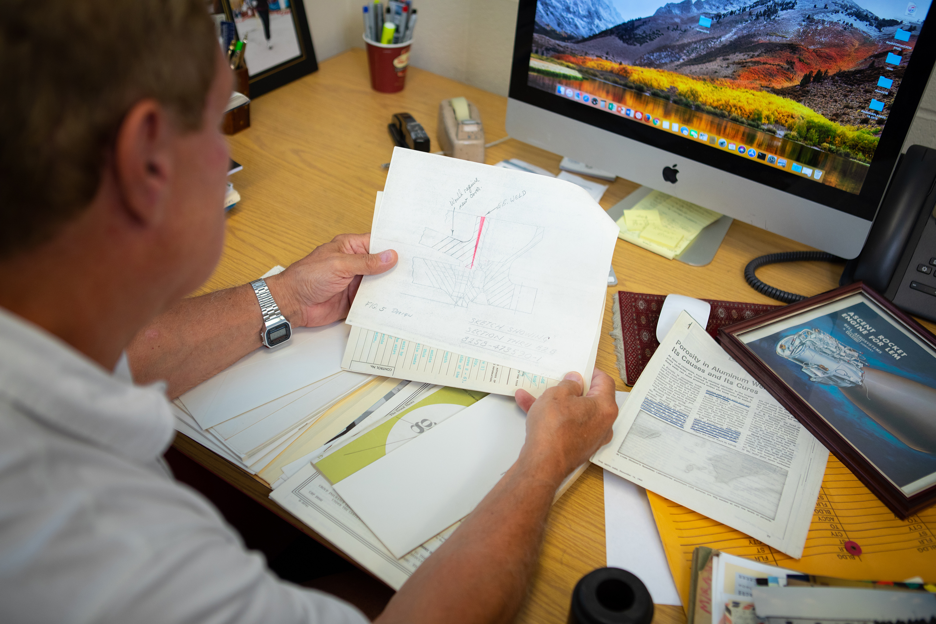 Mollendorf examines sketches from a file folder filled with papers from his 1966 summer job at Bell Aerosystems. The drawings deal with welding, a process that he sought to improve as part of his work at Bell. Credit: Douglas Levere / University at Buffalo