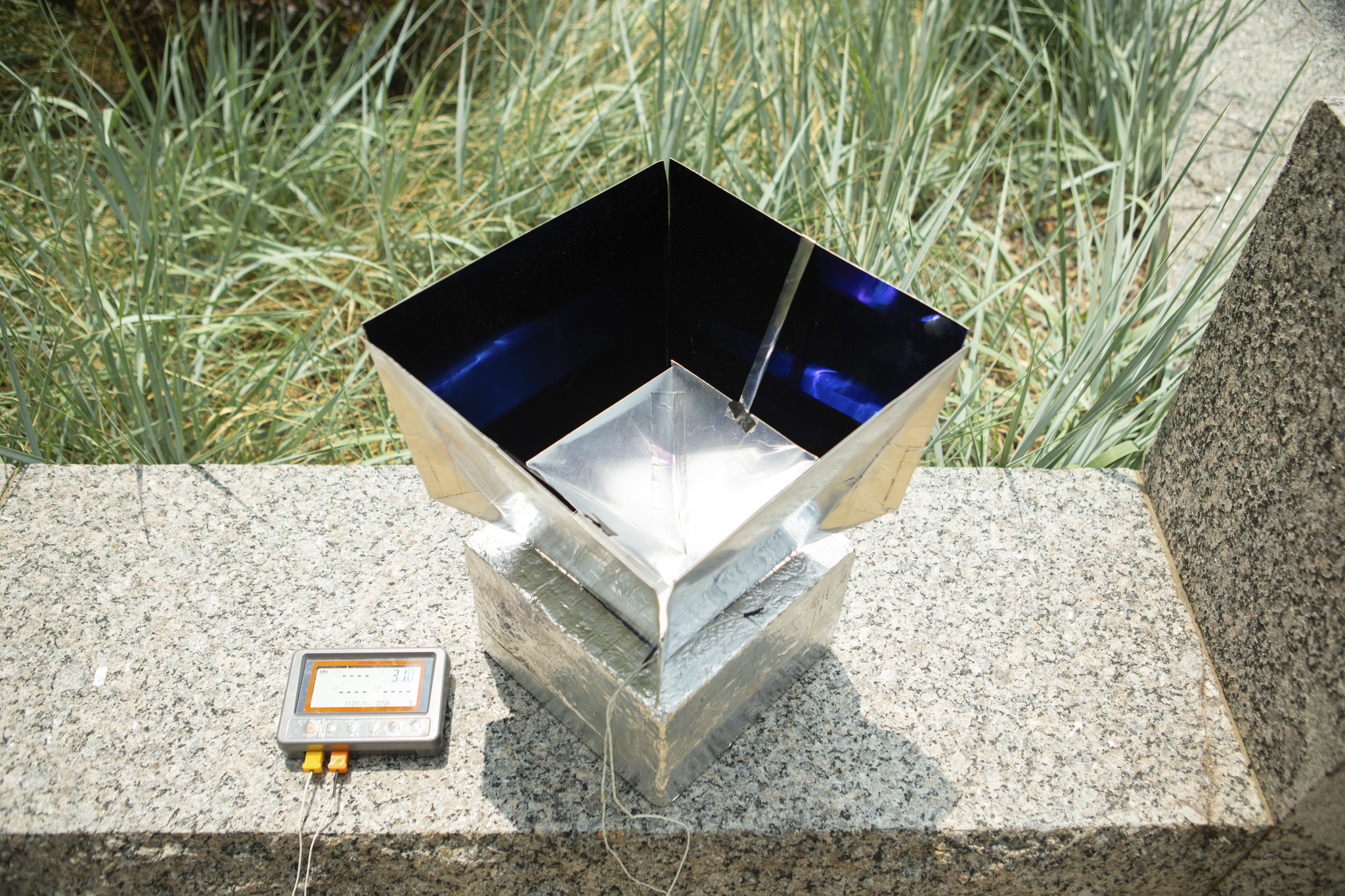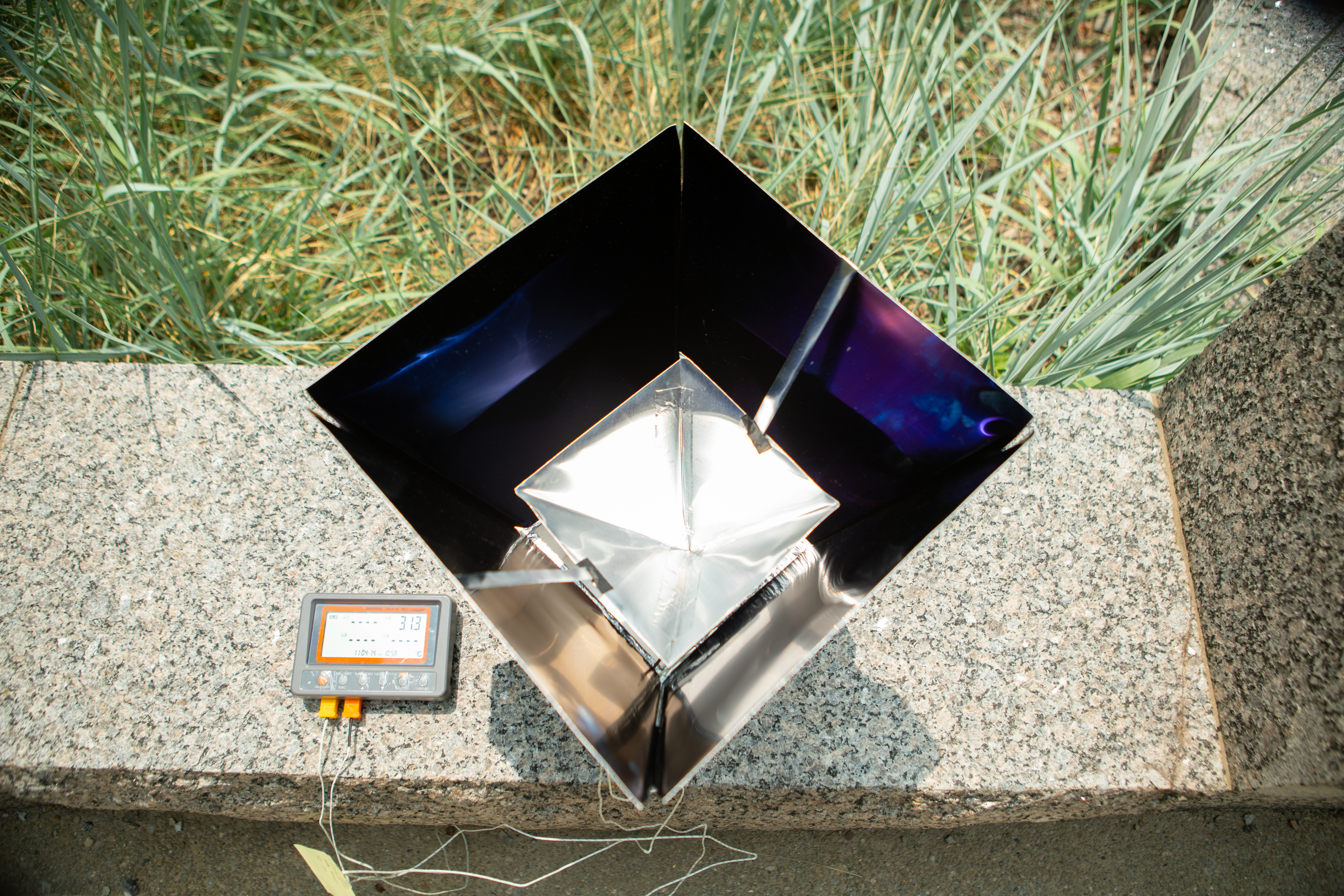 Engineers placed the material at the bottom of a foam box and erected a solar “shelter” atop the box, using a solar energy-absorbing material to construct four outward-slanting walls, along with an inverted square cone within those walls.