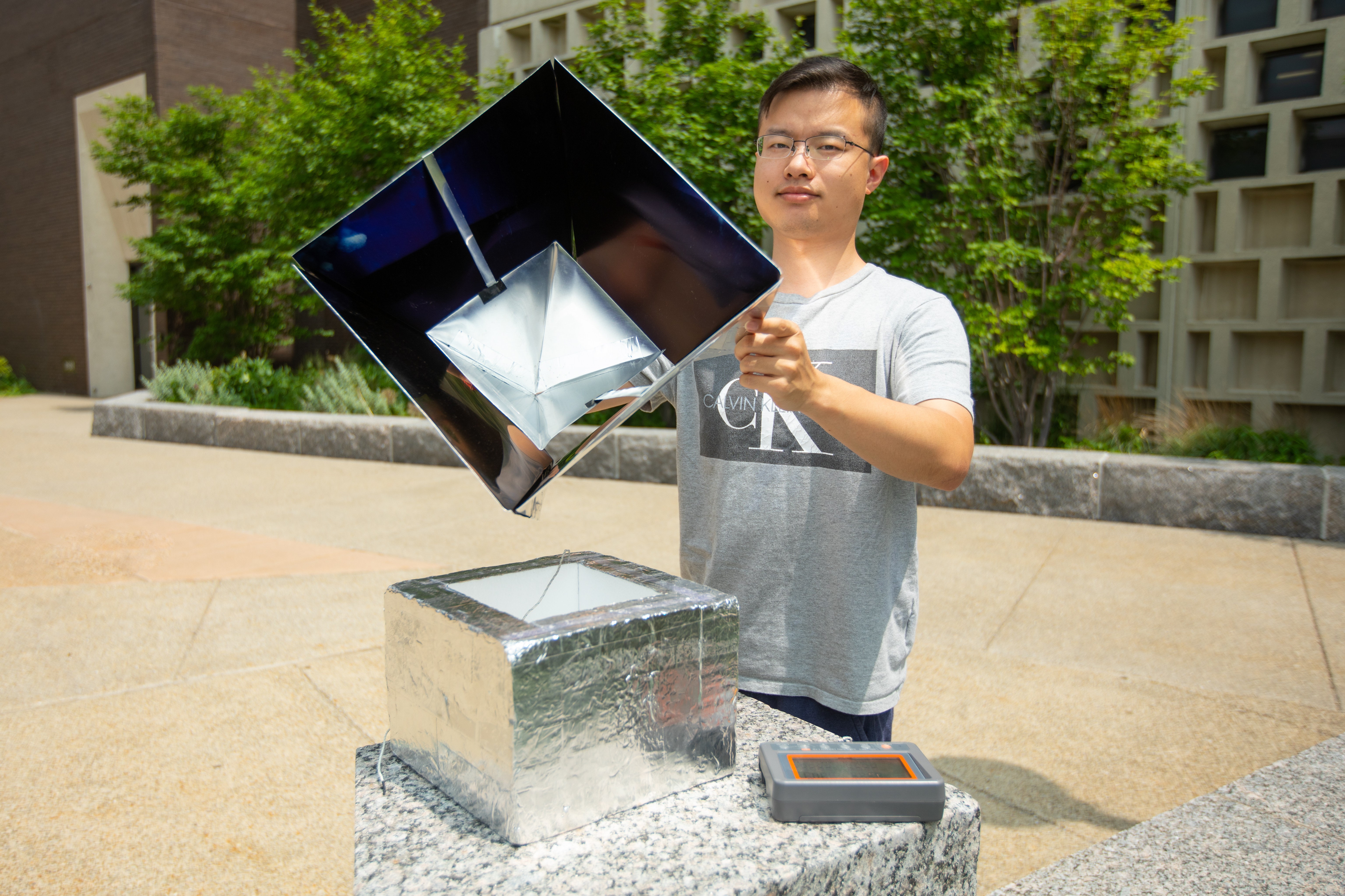 Lyu Zhou, UB PhD candidate in electrical engineering, holds an important component of the radiative cooling system: a specially designed solar shelter that helps beam thermal radiation into the sky. Credit: Douglas Levere / University at Buffalo