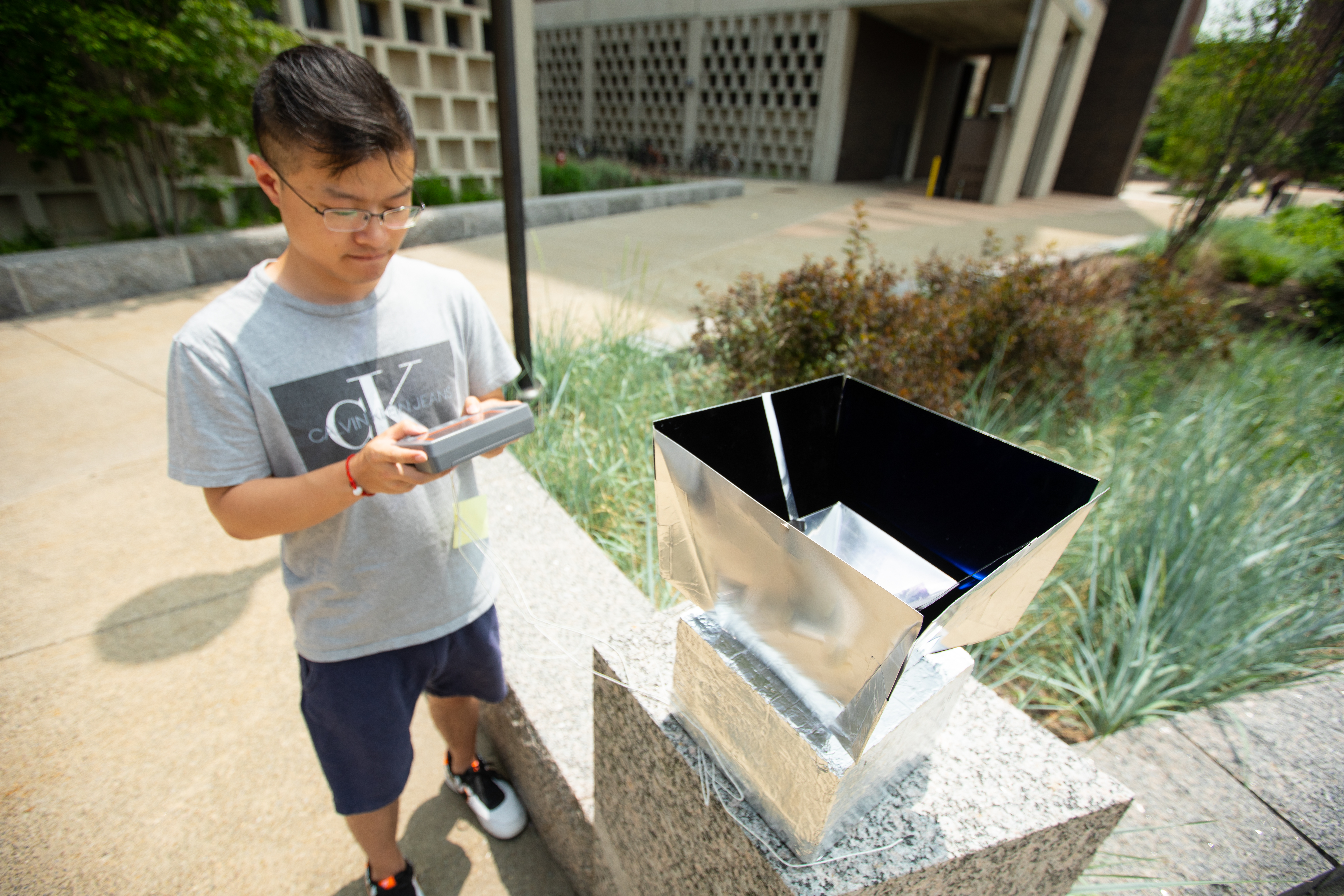 Lyu Zhou, UB PhD candidate in electrical engineering, tests the radiative cooling system. To cool a building, numerous units of such a system would need to be installed to cover a roof. Credit: Douglas Levere / University at Buffalo