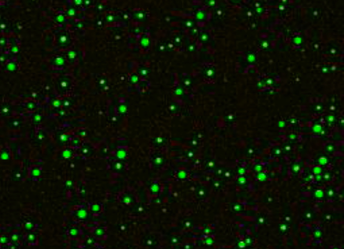 Like stars in the night, liquid droplets of RNA (the bright green spheres) float in a solution containing high concentrations of divalent magnesium cations. The droplets are imaged through confocal fluorescence microscopy. Credit: P. Onuchic, A. Milin, I. Alshareedah, A. Deniz and P. Banerjee, Scientific Reports, Aug. 21, 2019. This work is licensed under CC BY-4.0 (https://creativecommons.org/licenses/by/4.0/).