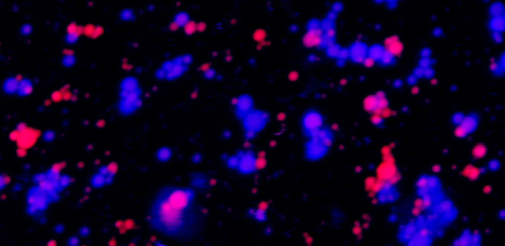A two-color fluorescence microscopy image shows liquid droplets made from an arginine-rich protein and a purine-rich RNA. The blue and red droplets are made from the same materials (both protein and RNA), but tagged with different dyes to aid visualization. In many places, the droplets — floating freely in a solution — coexist but don't mix. Credit: Ibraheem Alshareedah / Priya Banerjee Laboratory