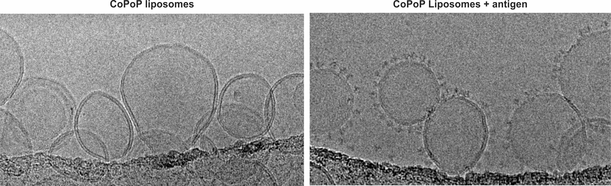 University at Buffalo spinoff POP Biotechnologies’ vaccine delivery platform consists of specialized liposomes that bind to vaccine antigens. Transmission electron microscopy images show some of these liposomes with and without antigens attached. Credit: Jonathan Lovell / University at Buffalo