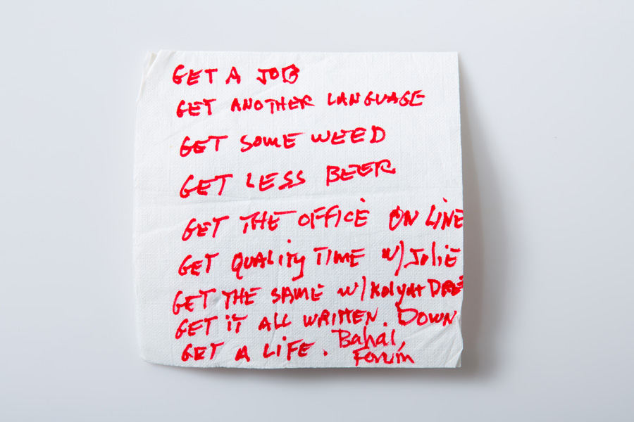 Paper Napkin by Jack Powers: Powers, founder of the Stone Soup Poets, scribbled this list onto a napkin. Other than sharing a comical to-do list, the poem demonstrates the many objects poetry can reside on or in, including bottles, mail and napkins.